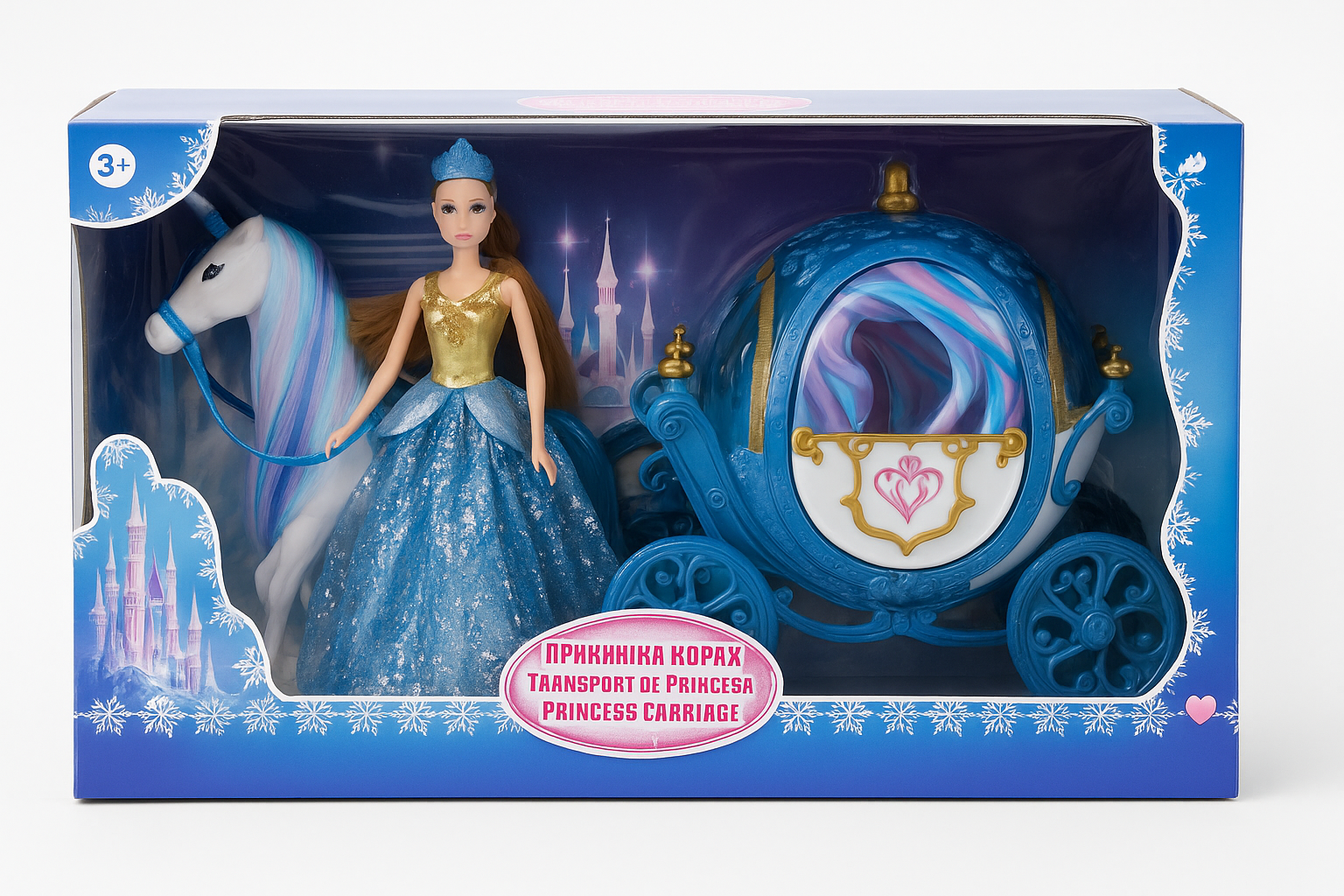 Čarobni set princeze sa kočijom koji uključuje elegantnu princezu u plavoj haljini, belog konja i raskošnu kočiju. Ovaj bajkoviti set omogućava deci da stvore svoje vlastite princeze priče i avanture.