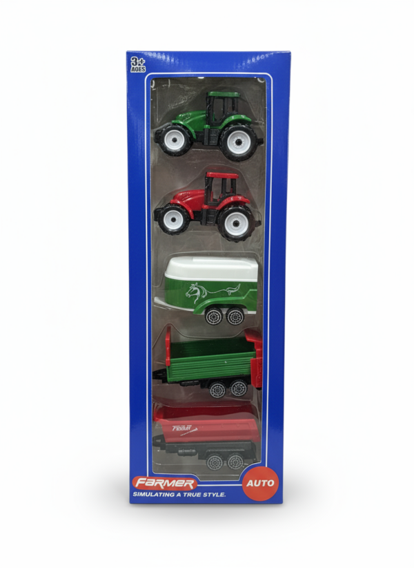 Profesionalni set igračaka farmerskih vozila koji će oduševiti svakog malog farmera! Ovaj kvalitetan set sadrži 5 detaljno izrađenih delova: zeleni traktor, crveni traktor, zelenu prikolicu, crvenu prikolicu i dodatnu farmersku opremu.